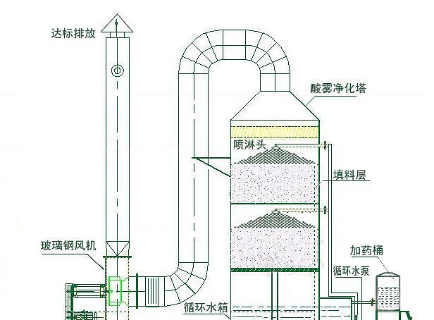 喷淋除尘塔为圆筒型结构形式,喷淋吸收系统主要由填料、喷淋装置、除雾装置、循环泵、吸收塔组成。